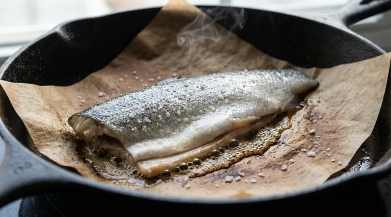 Sartén de hierro fundido muy caliente sella pescados sin pegarse nunca.