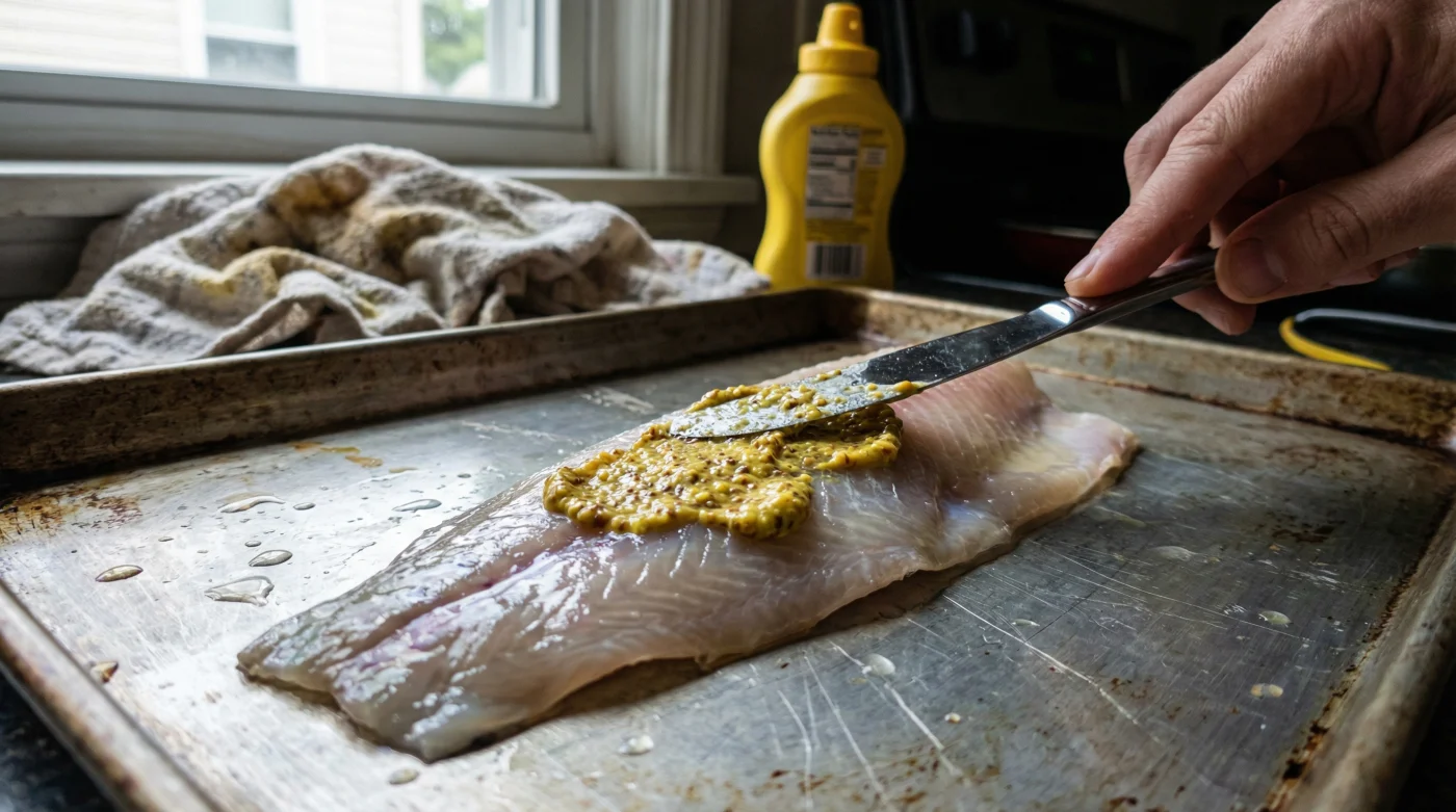 Vierte un poco de mostaza amarilla clásica en la palma de tus manos. No necesitas mostazas francesas de grano fino ni mezclas artesanales costosas; la mostaza amarilla brillante de supermercado tiene la proporción exacta de cúrcuma y vinagre suspendido que necesitamos. Unta una capa delgada sobre el pescado, como si estuvieras aplicando una crema suave. Asegúrate de cubrir cada rincón, prestando especial atención cerca de la espina central.