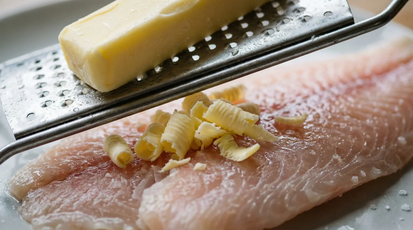 Saca el bloque de mantequilla del congelador justo en el instante en que lo vas a usar. Un consejo práctico: envuelve la mitad del bloque en un trozo de papel encerado. Esto evita que el calor de tu mano comience a derretirla mientras la sostienes. Usa el lado del rallador que usarías para un queso parmesano grueso. Deja caer las virutas directamente sobre el pescado, formando una pequeña cumbre dorada en la parte más gruesa del filete.