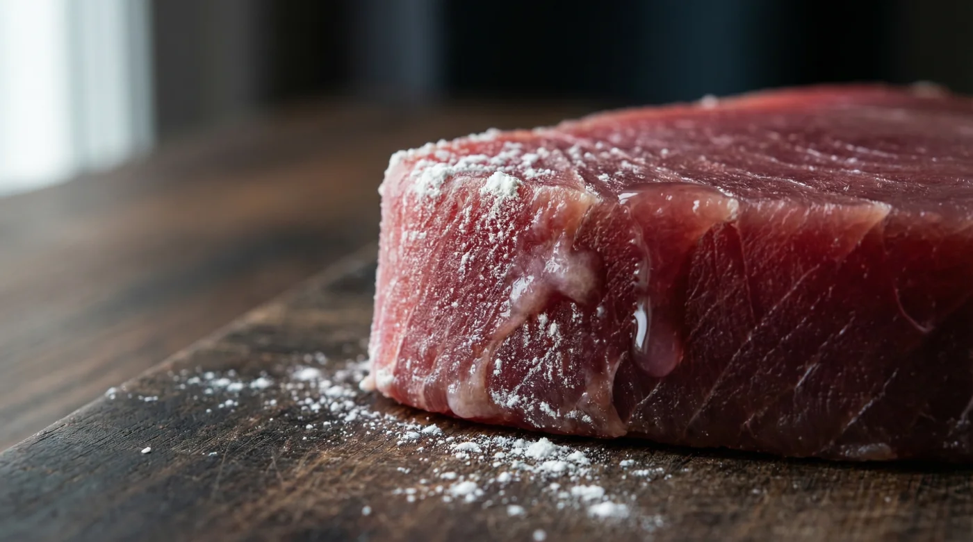 El éxito de esta técnica radica en el control físico del ingrediente, no en medidas matemáticas complicadas. Primero, toma unas toallas de papel de cocina y seca tu lomo de atún con firmeza. La humedad exterior es tu enemiga número uno; si aplicas polvo sobre agua, crearás un engrudo desagradable. Necesitas una superficie mate.
