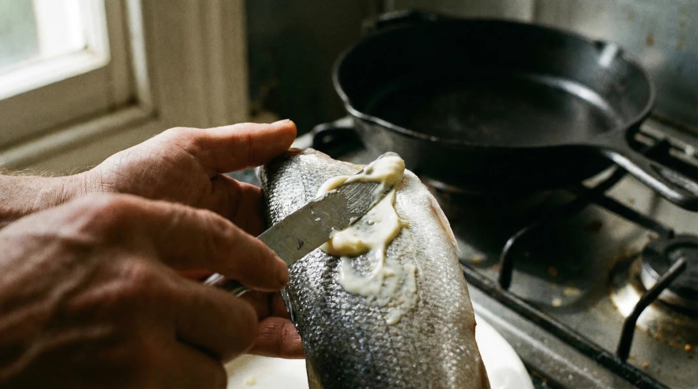 Para comprender por qué la mayonesa comercial supera con creces al aceite tradicional al momento de sellar pescados como el robalo, la trucha o el salmón, debemos analizar su estructura molecular. La mayonesa no es más que una emulsión estable de aceite, yemas de huevo (que aportan proteínas y fosfolípidos), un ácido como el vinagre o el limón, y trazas de azúcares. Cuando esta mezcla entra en contacto con una sartén precalentada a 200°C, ocurre una magia térmica conocida como la Reacción de Maillard. A diferencia del aceite líquido que se escurre hacia los bordes de la sartén dejando zonas de la piel desprotegidas, la mayonesa se adhiere uniformemente a los tejidos del pescado. El calor descompone rápidamente la emulsión: el aceite se libera exactamente donde se necesita, mientras que las proteínas del huevo y los azúcares se caramelizan al instante, formando una costra dorada que actúa como un escudo antiadherente físico entre la piel del pez y el metal fundido.