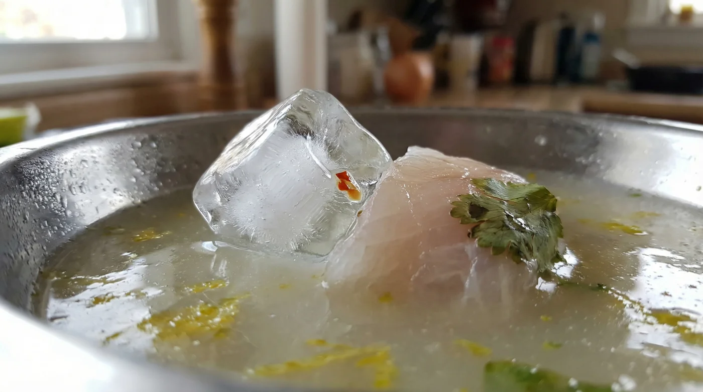 No necesitas equipo especial, solo entender la física de tu cocina y estar presente. Corta el pescado en cubos uniformes para que la sal y el frío actúen de manera pareja. Sala el pescado primero para reafirmar sus fibras. Luego, vierte el jugo de limón recién exprimido. Y aquí es donde aplicas el truco vital: suelta dos cubos de hielo limpios y sólidos directamente en la mezcla.