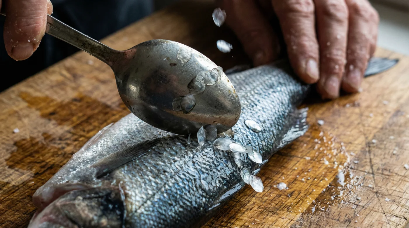 Toma la cola del pez con tu mano no dominante. Si resbala mucho, usa un trozo de papel absorbente para sostenerla con una firmeza impecable. Ahora, toma la cuchara por el mango, acercando tu dedo índice a la base cóncava para tener el control total del peso. Voltea la cuchara de modo que la parte honda mire hacia el techo y el borde frote directamente contra el pescado. Este es el secreto del contacto.