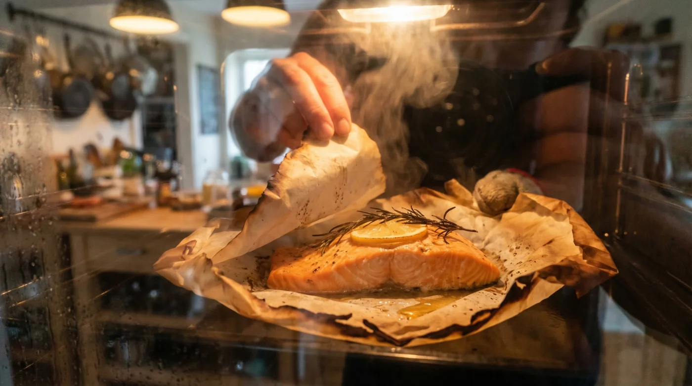 - 3. Sella el sabor: Dobla el papel pergamino sobre el salmón y sella los bordes enrollándolos firmemente para que no escape el vapor. Hornea a 200°C por 12 a 15 minutos.