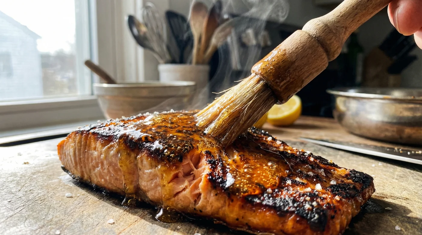 Escuchas el siseo agudo cuando la piel del salmón toca el hierro caliente. Huele a mar, a mantequilla tostada y a la promesa de una cena que te saque de la rutina. Pero entonces, cometes el error clásico: viertes la mezcla de miel de abejas directamente sobre el sartén. En cuestión de segundos, el humo blanco se vuelve gris. El dulce no abraza al pescado; se aferra al fondo de la olla, quemándose hasta formar una costra amarga y oscura que te tomará horas fregar. Sirves en el plato un trozo opaco y reseco, sintiendo esa punzada de frustración porque el brillo espectacular de los restaurantes, una vez más, se te escapa entre los dedos.