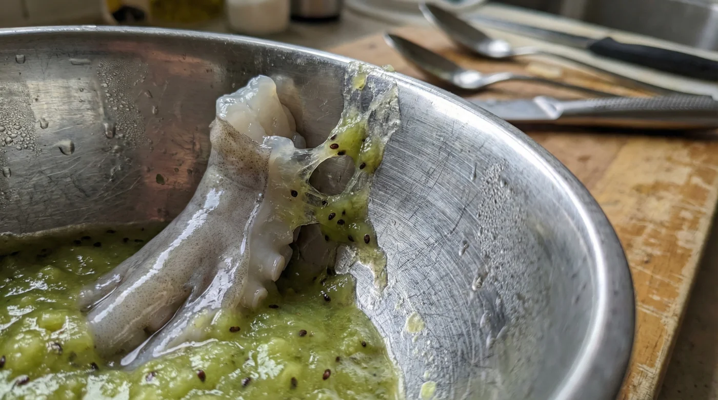 ¿El pulpo sabrá a kiwi después del enjuague? No. Si lavas los tentáculos meticulosamente bajo el agua fría durante un minuto continuo, el sabor dulce desaparece por completo y solo queda la textura suave de la carne.