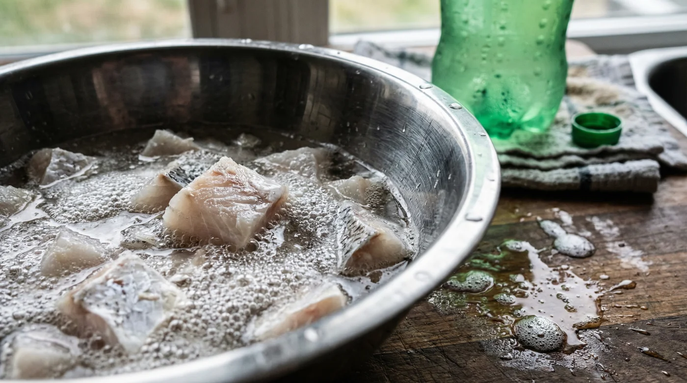 Abre tu botella de refresco de limón transparente. Escucha ese sonido agudo del gas escapando: ese es tu indicador primario de calidad. Vierte el líquido lentamente hasta cubrir apenas los cubos de pescado. Notarás casi de inmediato que cientos de pequeñas burbujas se adhieren a la superficie de la carne, como si el pescado estuviera respirando bajo el agua dulce.