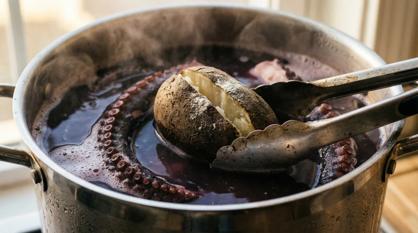Imagina la cocción como un diálogo íntimo entre la tensión del músculo marino y la paciencia de la tierra. Cuando hierves un pulpo basándote solo en el reloj, estás adivinando, esperando ciegamente. Al introducir una papa pastusa entera en el agua al mismo tiempo que el animal, transformas tu olla en un ecosistema transparente con su propio ritmo natural.