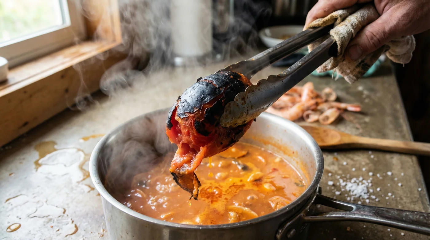El sabor nunca es un color plano, es una resonancia viva. Cuando dependes del caldo artificial empacado, tu plato respira a través de una almohada. El sabor está ahí, pero ahogado, uniforme, sin los bordes brillantes ni los matices reales del mar. Aquí es donde entra la técnica de asar los tomates chontos antes de licuarlos directamente con el caldo caliente de las cáscaras de tus mariscos.