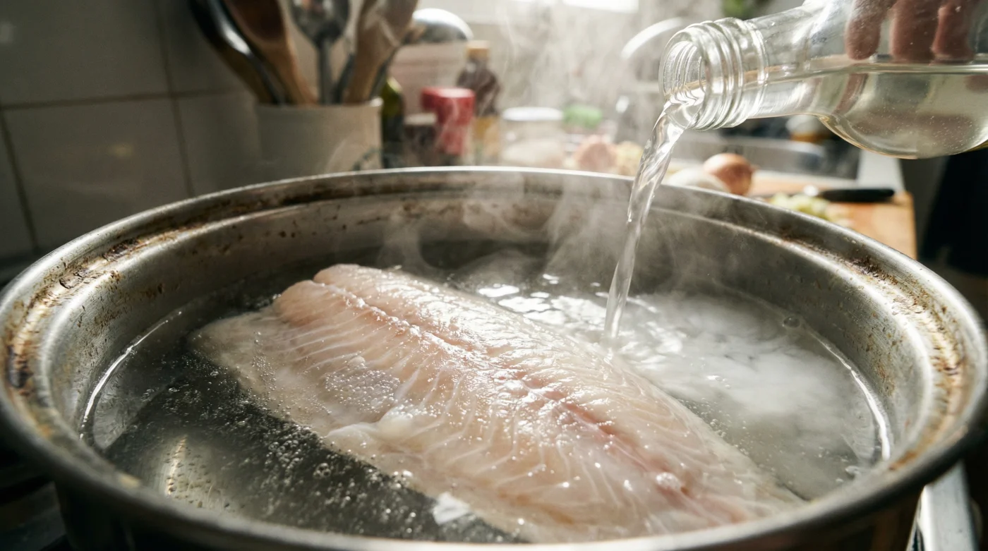 Aquí es donde entra la ciencia de la cocina cotidiana. Existe un truco antiguo, casi olvidado, que contradice la idea de que el pescado debe hervirse solo con sal y hierbas. El secreto para mantener ese filete íntegro, con una textura firme y un aspecto digno de restaurante, reposa en tu alacena: el vinagre blanco. Un chorrito de este líquido económico y común es suficiente para cambiar las reglas de la cocción, endureciendo suavemente las proteínas superficiales del pescado antes de que el calor tenga la oportunidad de separarlas.