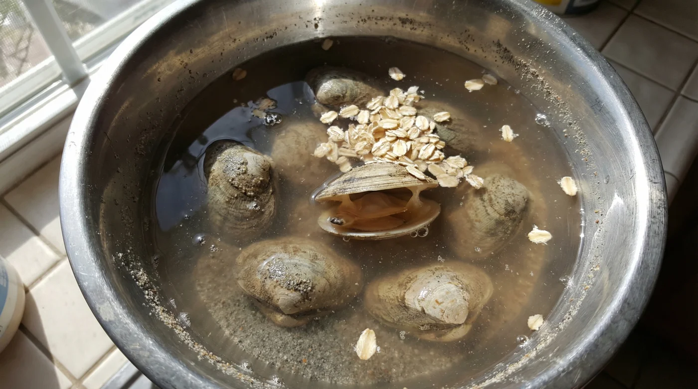 Sumerge tus almejas previamente enjuagadas con mucho cuidado. Ahora llega el toque maestro: espolvorea dos cucharadas generosas de avena en hojuelas tradicionales sobre la superficie del agua. Por favor, no uses avena instantánea molida ni opciones con saborizantes. Deja que las hojuelas floten y se hidraten lentamente. Observa el recipiente; en unos cinco minutos verás cómo las conchas se abren tímidamente y el agua empieza a enturbiarse por la actividad.