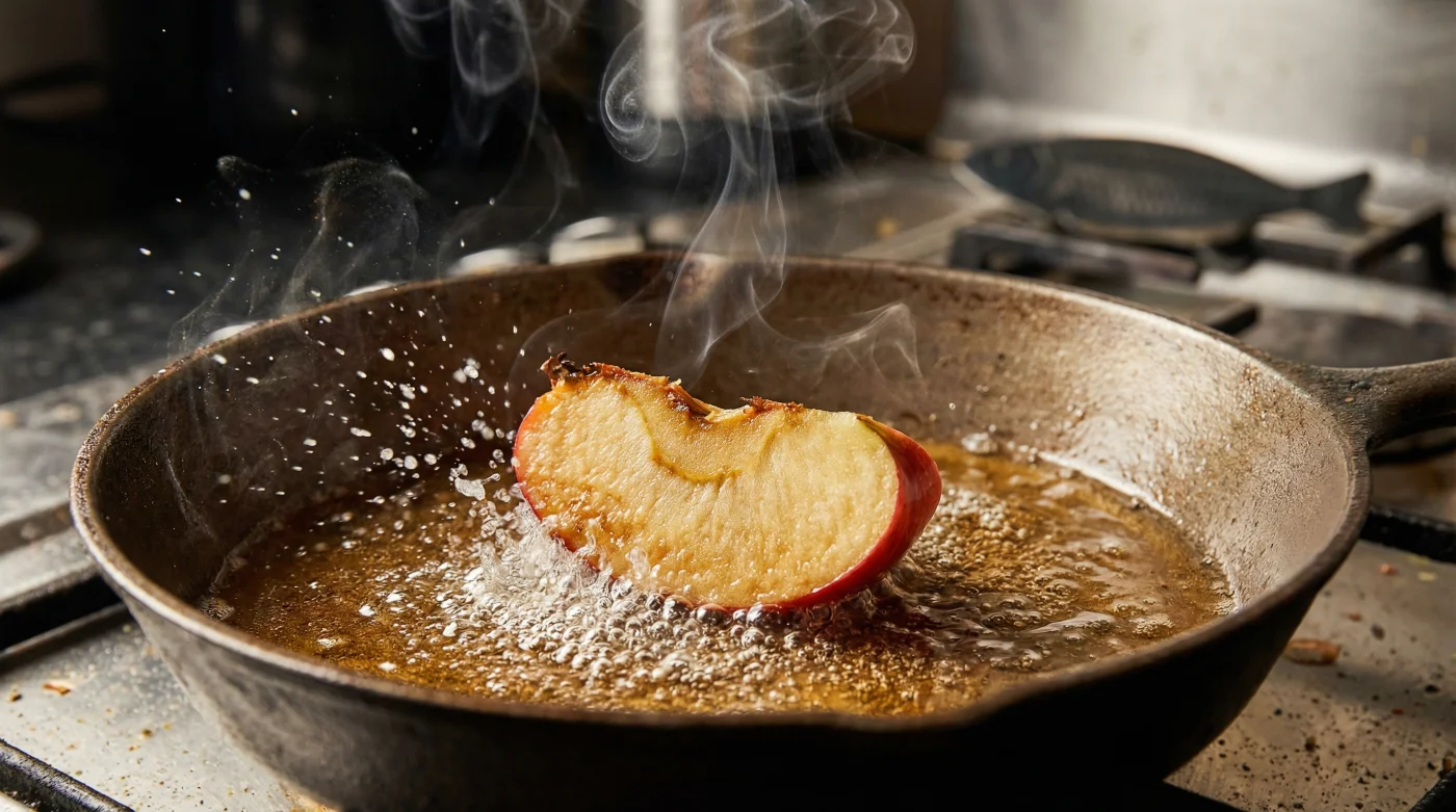 Justo en el momento en que pones tu pescado en la sartén, desliza suavemente la rodaja de manzana en el aceite. Verás que empieza a burbujear a un ritmo diferente al del pescado. Este es el instante exacto en el que ocurre el milagro silencioso: la temperatura despierta las propiedades de la fruta.
