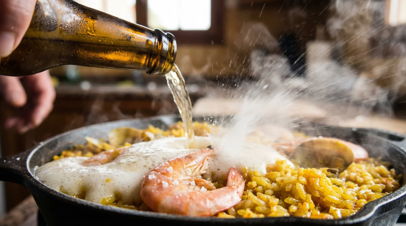 Para un caldero estándar donde preparas una libra de arroz, un cuarto o media taza de cerveza helada es más que suficiente para bajar la temperatura drásticamente sin ahogar tu preparación.¿Los mariscos se endurecen al recibir este líquido tan frío?