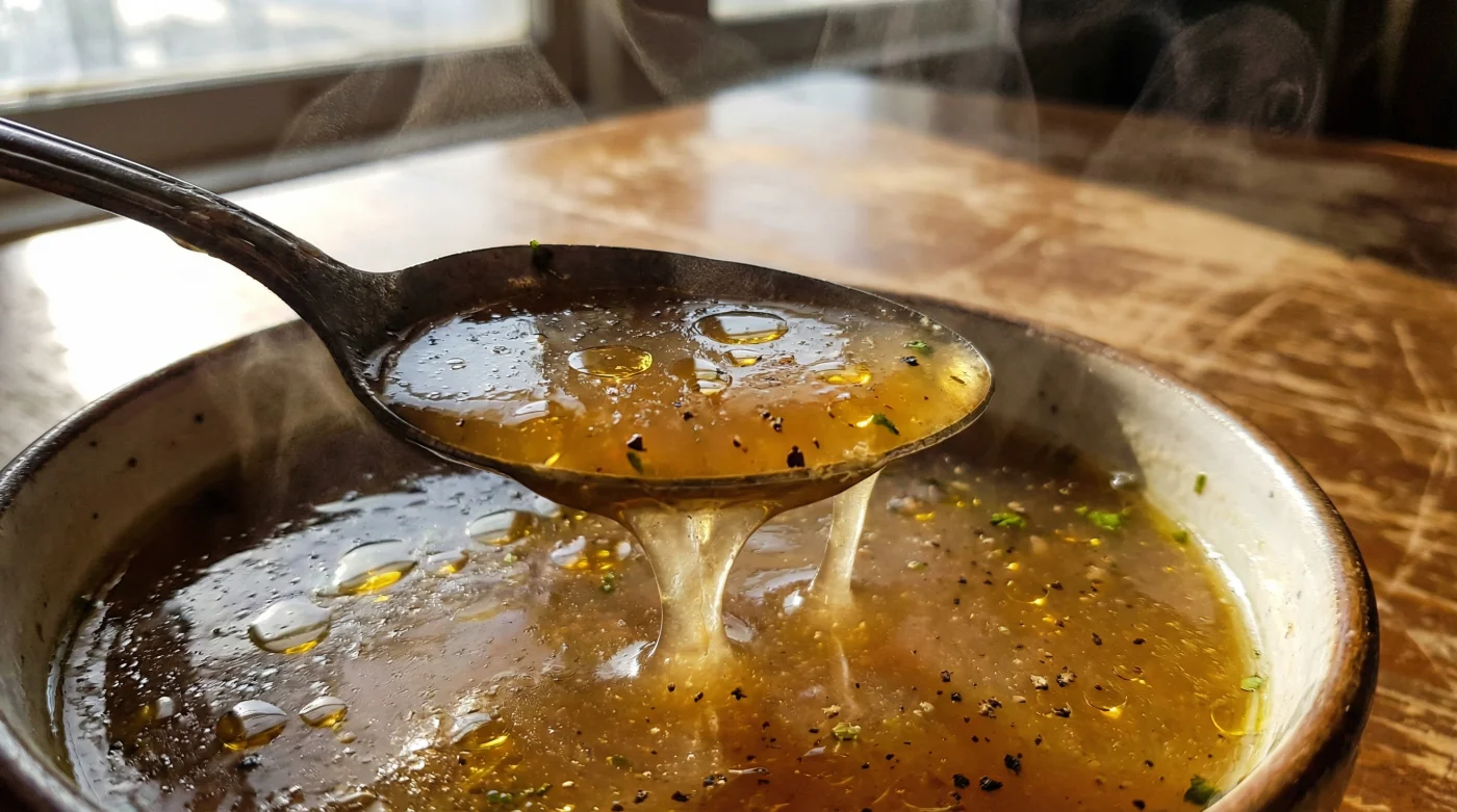 | Densidad del Colágeno | La gelatina aporta cadenas de proteínas puras que atrapan el agua, aumentando la viscosidad del líquido base. | El caldo cubre el reverso de la cuchara y deja los labios ligeramente pegajosos, imitando una reducción larga. |