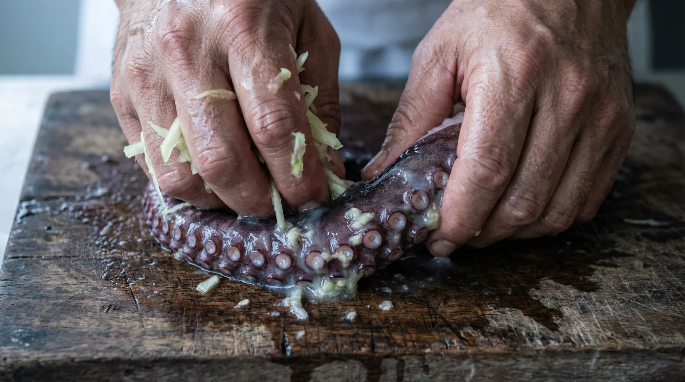Toma un puñado generoso de esta pulpa áspera y comienza a frotarla directamente sobre los tentáculos del pulpo crudo. Hazlo con firmeza, asegurándote de cubrir cada centímetro, desde la base gruesa cerca de la cabeza hasta las puntas más delgadas. Siente cómo la textura de las pequeñas ventosas cambia ligeramente bajo la fricción de tus dedos.