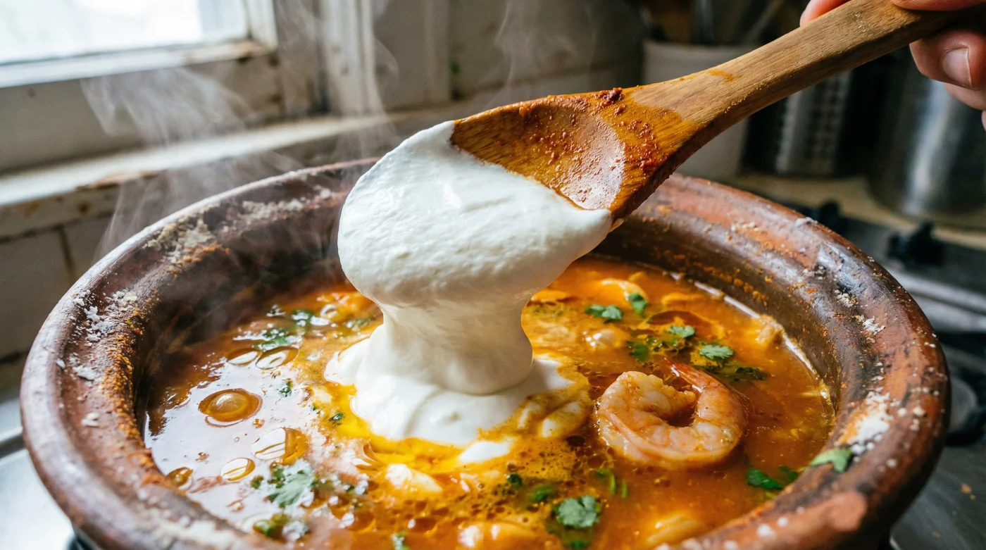 Repite el proceso con un cucharón más de caldo. Una vez que la mezcla en tu tazón esté caliente al tacto y completamente líquida, viértela suavemente de regreso a la olla principal, revolviendo con movimientos envolventes. La cazuela adquirirá un tono opaco, brillante y una textura sedosa instantánea. Al no haber fuego directo, el yogur abraza el líquido sin romperse. Nunca vuelvas a hervir la preparación después de este paso.
