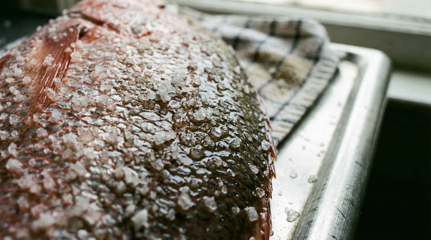 - Sal marina gruesa frotada en la piel del pargo garantiza fritura extracrujiente.