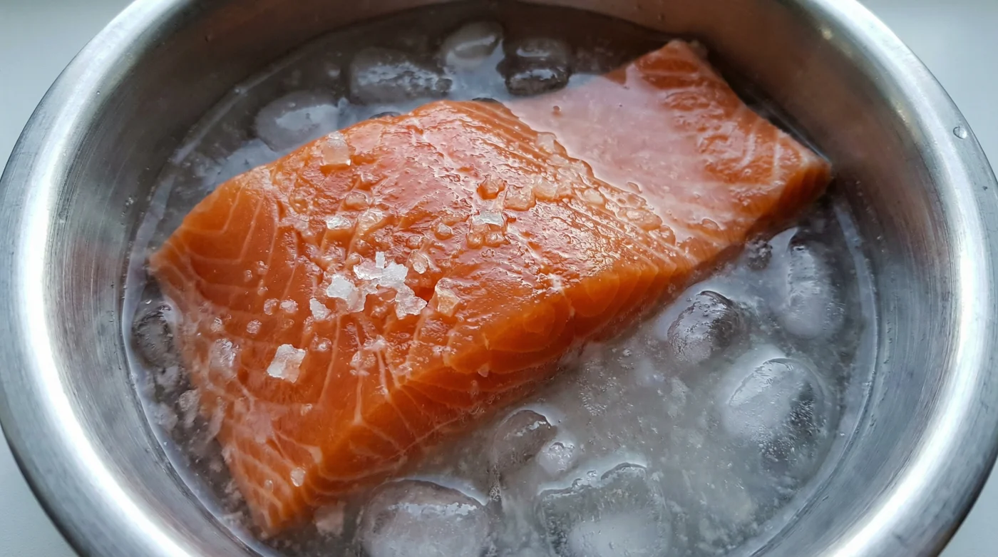 - La inmersión: Sumerge los filetes crudos (fuera de su empaque plástico) directamente en la salmuera gélida.