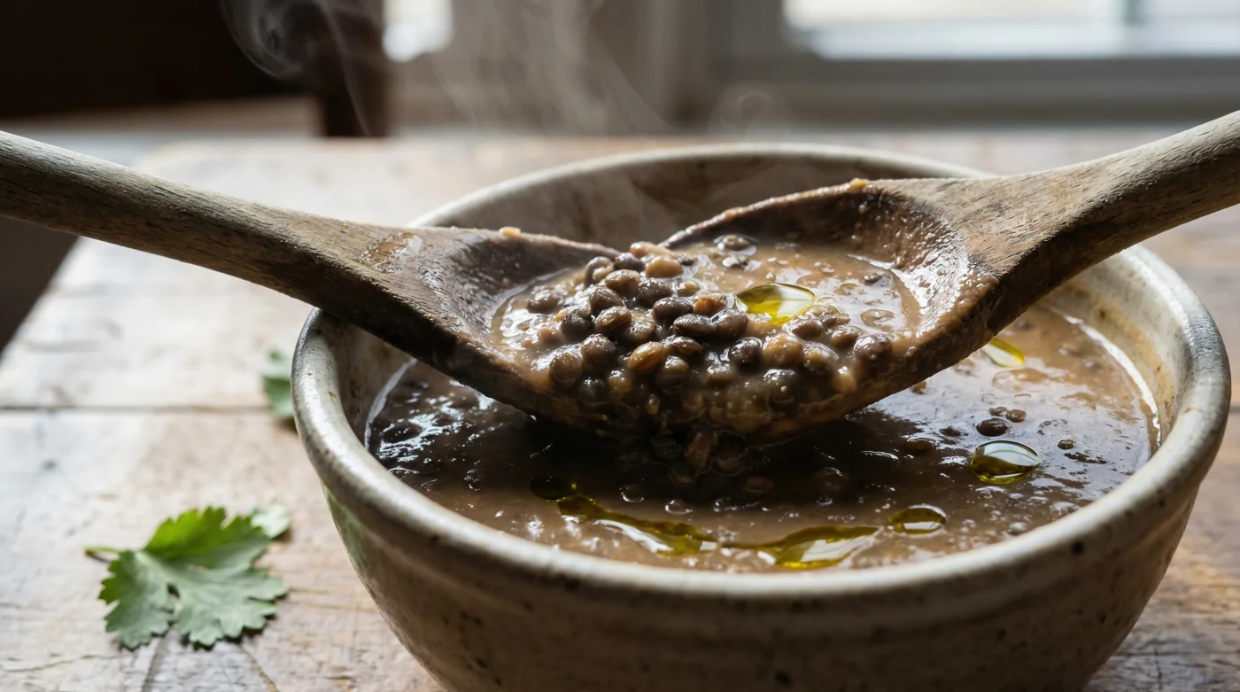 Para el purista del grano, aquel que disfruta sentir la resistencia tierna de la legumbre al morder, basta con retirar apenas media taza del caldo junto con un puñado modesto de lentejas. Al licuar esta pequeña porción y regresarla al calor, el líquido pierde su transparencia y adquiere un cuerpo ligero; una salsa sutil que cubre el dorso de la cuchara sin esconder la belleza de la lenteja entera.