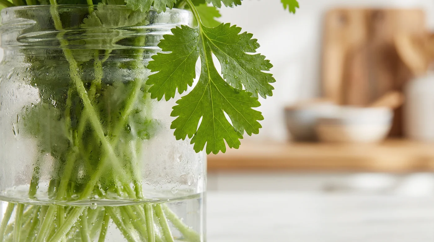 - Frascos de vidrio con agua fría prolongan la frescura del cilantro por más de tres semanas.