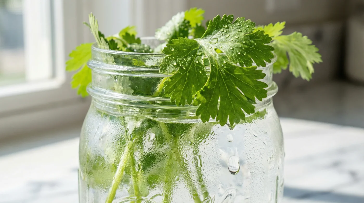 Piensa en tus hierbas aromáticas como si fueran las rosas que te regalan en una fecha especial. Nadie guarda un ramo de flores dentro de una bolsa sellada en un cajón. Necesitan beber agua limpia y fría para mantener la presión de sus paredes celulares intacta. La solución para este dolor de cabeza culinario no requiere artefactos costosos de importación ni máquinas selladoras ruidosas; la técnica real reside en imitar el ecosistema de un florero tradicional. Al proporcionar una fuente constante de líquido desde la base del corte y permitir que la corona respire libremente bajo un techo holgado, cambias de tajo las reglas del juego.
