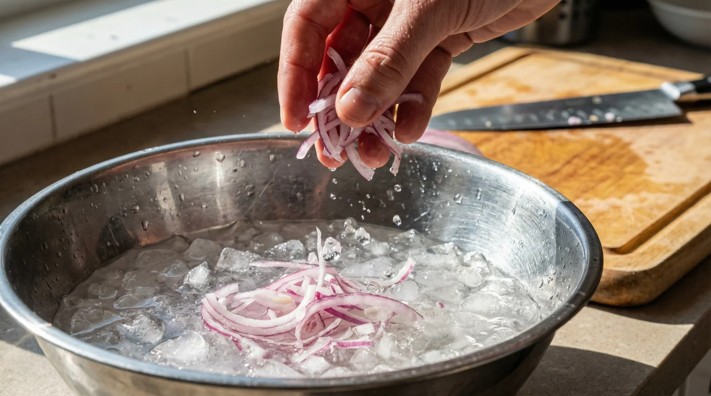 Aquí es donde un simple tazón de agua con hielo se convierte en tu mejor herramienta técnica. Al sumergir los cortes finos en agua a punto de congelación, no solo diluyes el ácido sulfúrico que irrita tu boca, sino que fortaleces las paredes celulares con el frío, logrando que la cebolla morada ofrezca esa resistencia perfecta al morderla.