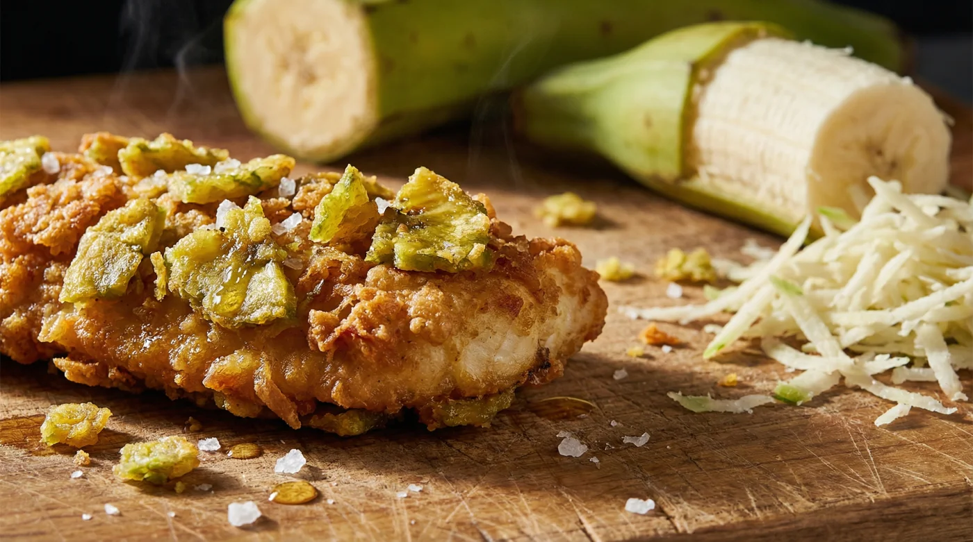 Si tienes a la mano un filete de robalo, tilapia o cualquier pescado blanco, necesitas tratarlo con suma delicadeza. Aquí, el plátano rallado actúa como una red protectora. Seca el pescado, pásalo por una capa finísima de mostaza o huevo batido y presiona suavemente las hebras de plátano verde sobre la carne, sin aplastar demasiado. Fríe a fuego medio-alto en aceite de girasol. La sal gruesa debe ir mezclada directamente en el plátano crudo; de esta forma, al cristalizarse el almidón, el toque salino se funde y se fija permanentemente en cada hebra crujiente.