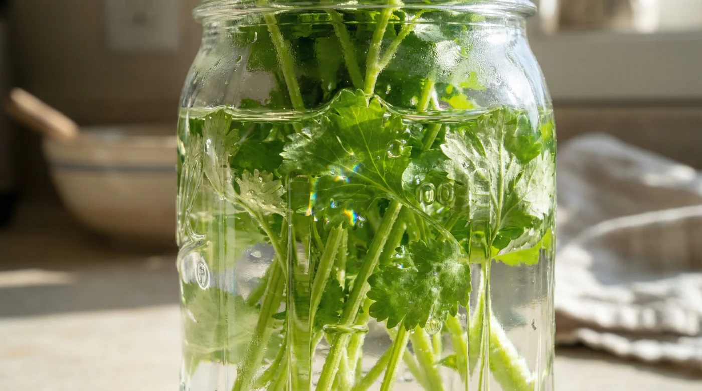 - Coloca el cilantro dentro del frasco, asegurándote de que solo los tallos toquen el agua. Las hojas deben quedar completamente secas.