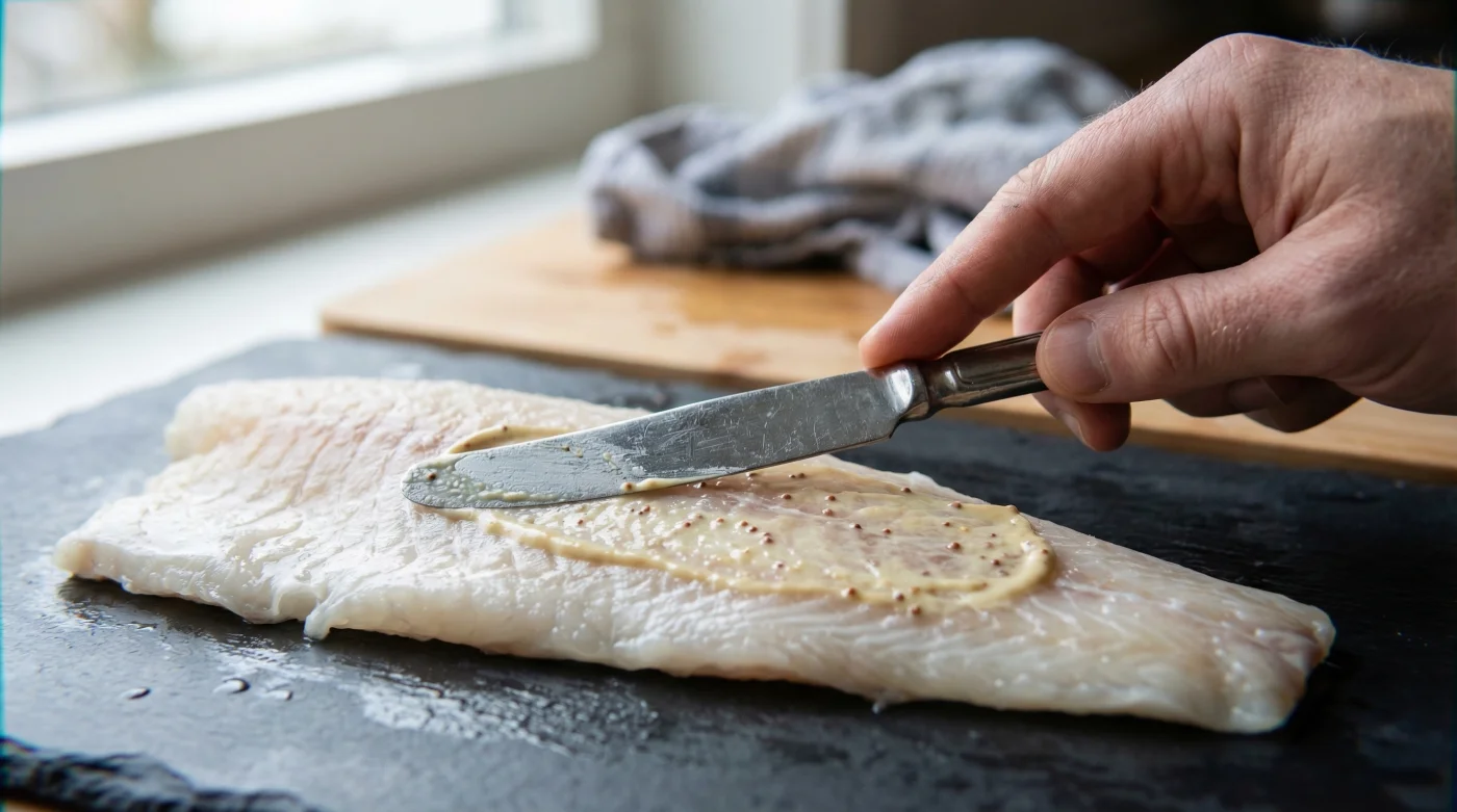 Con la superficie completamente seca, condimenta con una pizca moderada de sal marina y pimienta negra recién molida. A continuación, sumerge la punta de un pincel de repostería de cerdas de silicona en tu frasco de Mostaza Dijon. Aplica pasadas largas, suaves y firmes sobre la parte superior del pescado blanco. Recuerda siempre el diagnóstico previo: buscamos una capa casi translúcida, de apenas un milímetro de grosor, ya que en la alta cocina menos es definitivamente más.