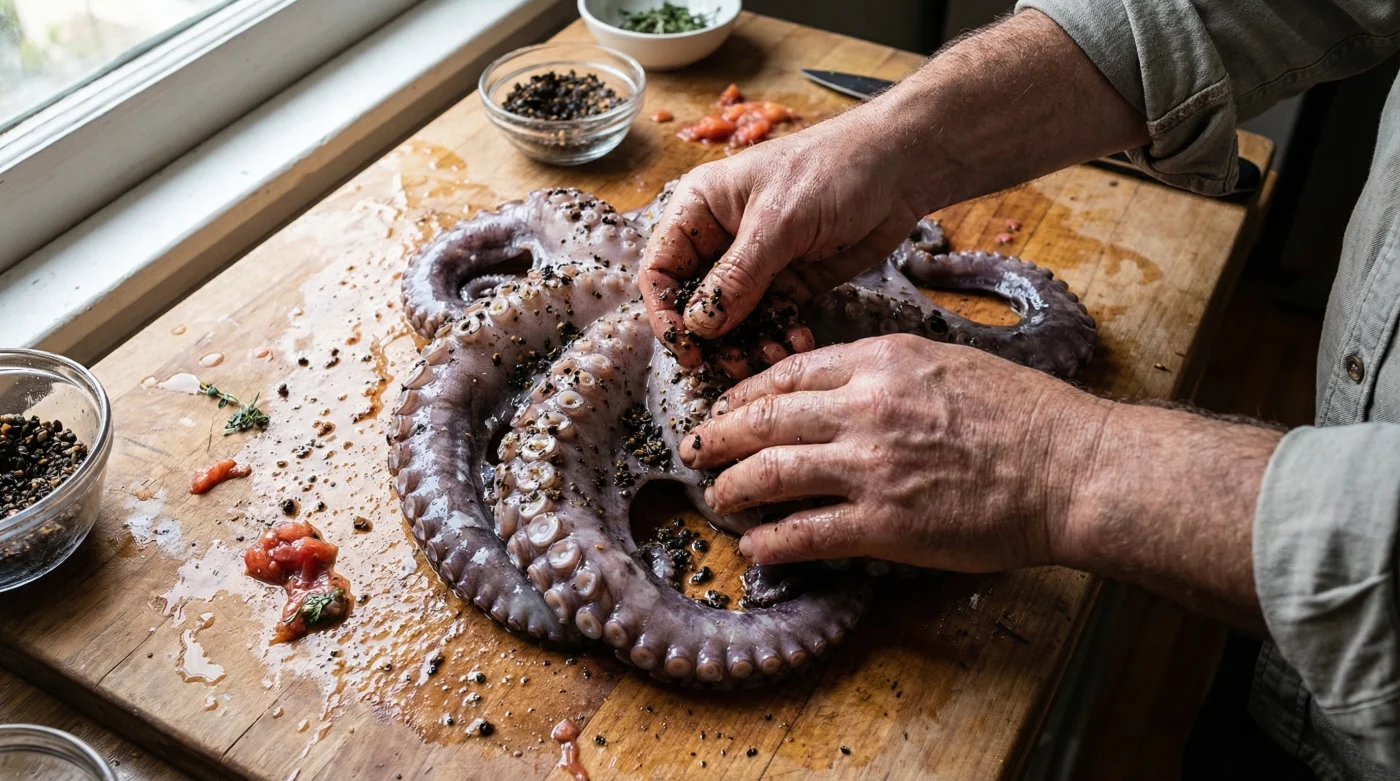 • Paso 2: Frota esta mezcla sobre tu pulpo crudo y entero. Masajea bien cada tentáculo para que la enzima penetre.