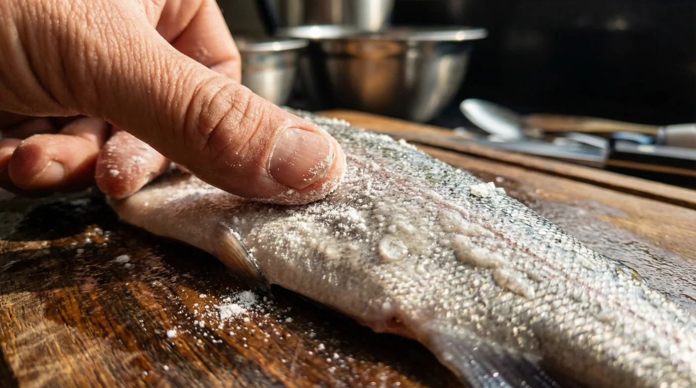 La genialidad de este truco radica en su capacidad de contradecir la intuición. Frotar polvo para hornear en la trucha no altera su sabor, pero cambia las reglas físicas del juego. Ese leve espolvoreo extrae la humedad superficial casi de inmediato. Además, y aquí está el verdadero secreto que la mayoría ignora: disminuye el nivel de pH en la superficie de la piel. Este sutil cambio químico acelera el proceso de dorado antes de que el calor tenga tiempo de penetrar demasiado en el filete.