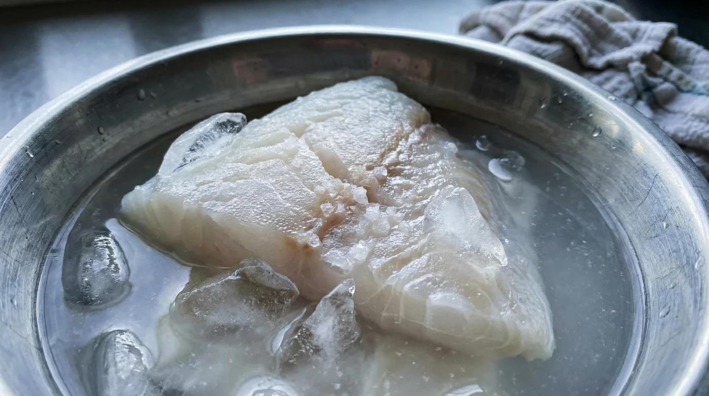 Para restaurar esa textura firme que creías perdida, necesitas crear tu propio ecosistema marino en miniatura. Busca un tazón amplio donde el pescado pueda estar completamente sumergido sin doblarse. Vierte un litro de agua a temperatura ambiente para poder disolver primero dos cucharadas soperas colmadas de sal marina gruesa. Una vez la sal desaparezca, agrega unos seis u ocho cubos de hielo grandes. Cuando el agua esté dolorosamente fría al tacto, desliza tus filetes de pescado blanco congelados dentro del baño. Déjalos tranquilos. No los agites, no los presiones. Deja que el frío y la sal hagan su trabajo silencioso.