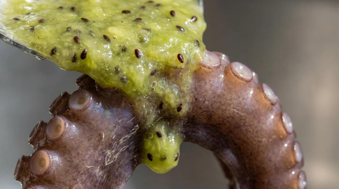 Coloca el pulpo crudo en un tazón de vidrio o cerámica amplia. Vierte el kiwi licuado sobre él y usa tus manos para masajear cada tentáculo. Siente cómo la textura de la fruta cubre cada ventosa y cada pliegue. Este contacto directo es exactamente donde ocurre el cambio.