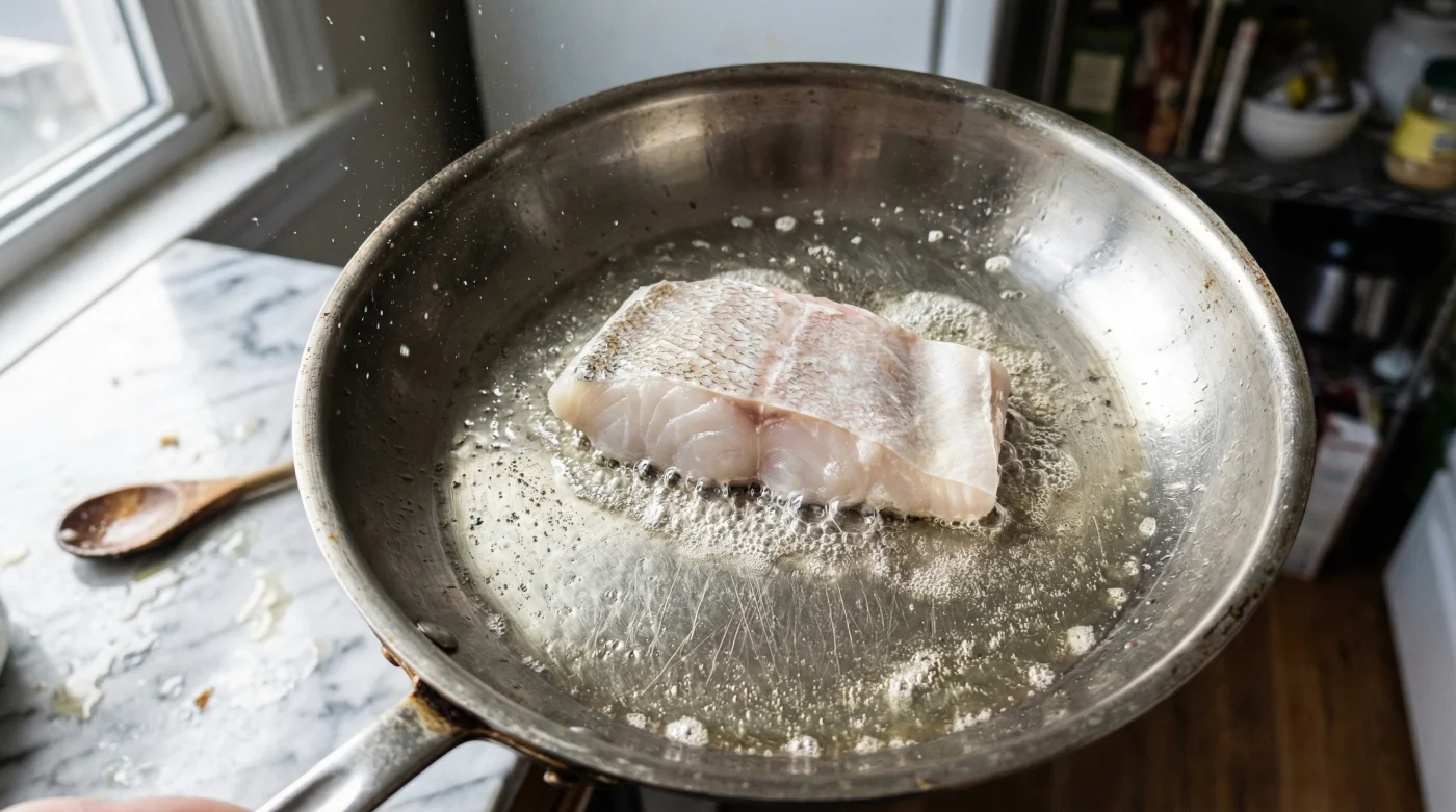Espera a que notes un ligero temblor en la superficie del aceite, justo antes de que empiece a emitir volutas de humo. Ese es el momento exacto donde alcanzamos los 204°C. Toma el pescado previamente salpimentado y deslízalo suavemente alejándolo de tu cuerpo. Escucharás un siseo fuerte, constante y agresivo; no te asustes, es el sonido del sellado perfecto operando a tu favor.