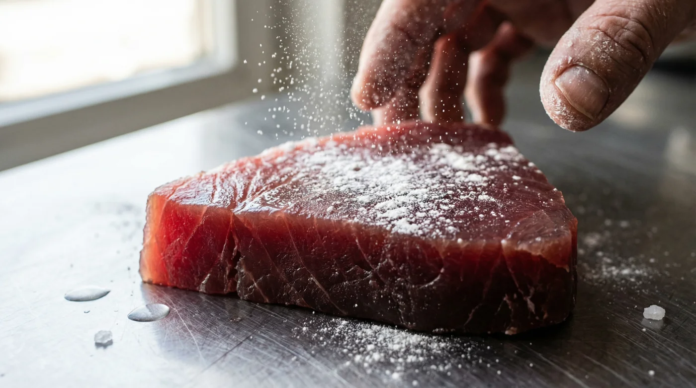 Al caer en la sartén, esa humedad atrapada en el almidón se gelatiniza instantáneamente y luego se fríe, creando un escudo protector crujiente. Este escudo aísla el delicado centro rubí del calor extremo. El fuego ataca la capa de fécula, dorándola de inmediato, en lugar de penetrar y cocinar las fibras musculares del pescado.