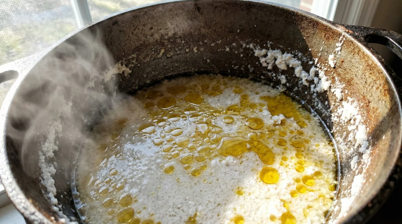 Pero cuando giras la perilla de la estufa al máximo y el líquido se acerca a los 100 grados Celsius, el caos se desata en el fondo del caldero de aluminio. El agua entra en un estado de ebullición violenta y agitada. Las proteínas del coco, que antes mantenían la paz entre los elementos, se desnaturalizan y colapsan por el exceso de calor y el movimiento brusco. Pierden por completo su capacidad de sostener la estructura interna. Como resultado físico, la grasa natural del coco se rinde y se separa abruptamente, subiendo a la superficie en forma de charcos de aceite brillante, mientras el agua y los sólidos pesados se hunden. Acabas de presenciar la destrucción térmica de una obra de arte culinaria.